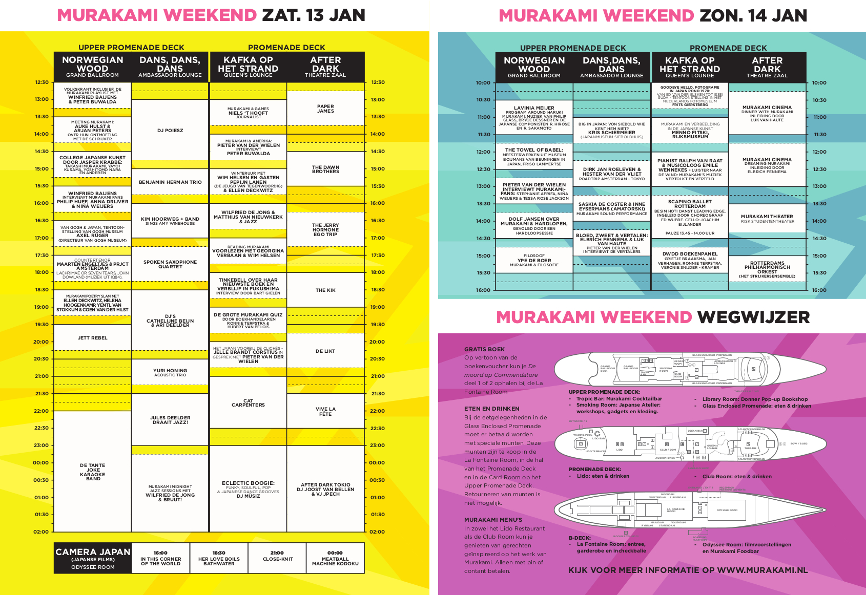 Het blokkenschema bekijk je op www.murakami.nl, daar vind je tevens gedetailleerde informatie over alle programmaonderdelen, tickets zijn daar ook te koop.