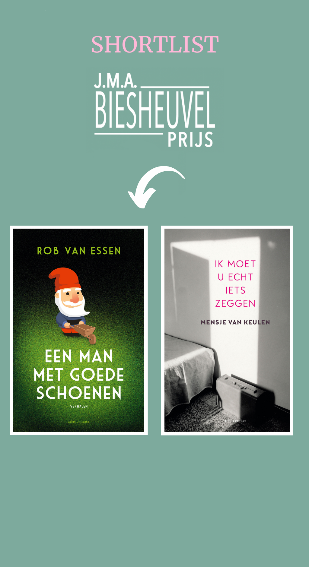 Een man met goede schoenen van Rob van Essen en Ik moet u echt iets zeggen van Mensje van Keulen staan op de shortlist van de J.M.A. Biesheuvelprijs 2021. Vrijdag 5 februari maakte de jury de drie genomineerden voor de jaarlijkse prijs voor de beste korteverhalenbundel in de Nederlandse taal bekend.